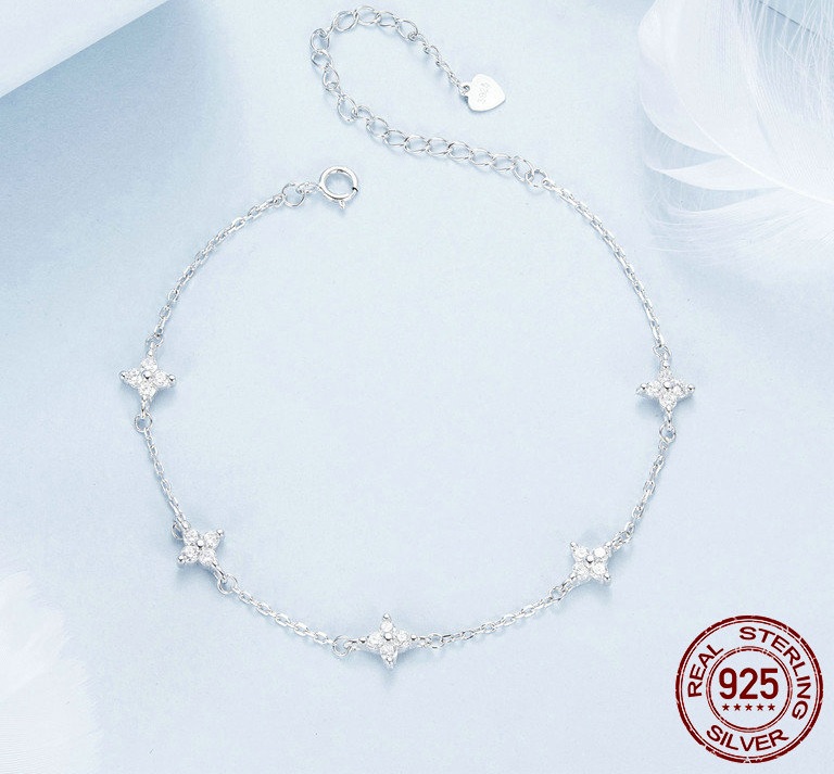 Add a touch of sparkle and charm to your look with this dainty sterling silver CZ clover anklet! ✨ Featuring delicately crafted four-leaf clover charms adorned with sparkling cubic zirconia stones, this lightweight and elegant design is perfect for everyday wear or special occasions.